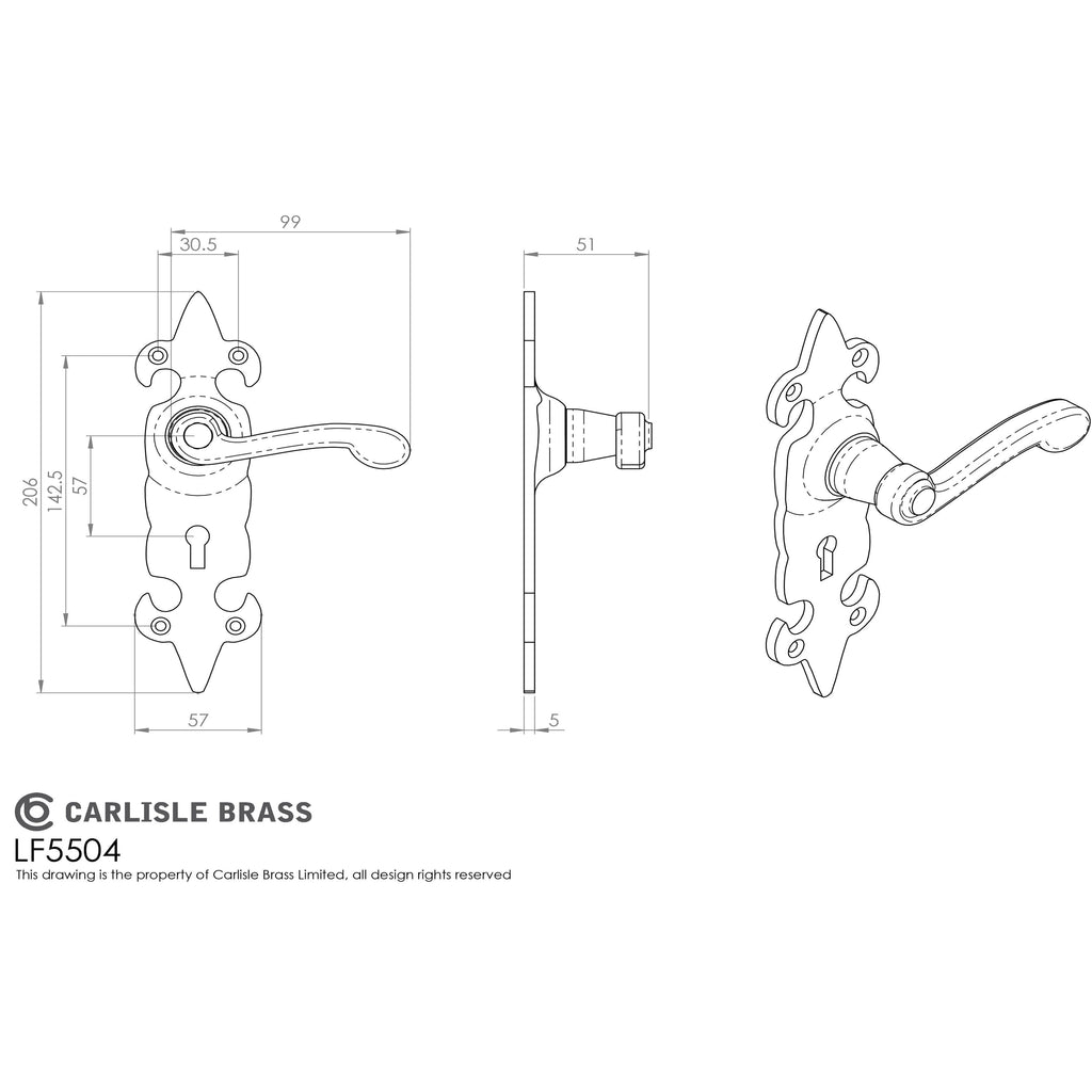 Black Antique lever on lock backplate. Standard profile 57mm c/c. A sturdy classical scroll lever on an undulating edged backplate with fleur-de-lys pattern top and bottom. Comes with a 10 year mechanical guarantee. Suitable for domestic use. Ludlow Black Antique is a traditional range of furniture with a powder coated Black finish.