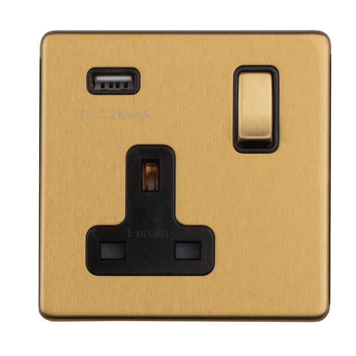 Eurolite Concealed 3mm 1 Gang Switched Socket With Usb - Satin Brass - ECSB1USBB