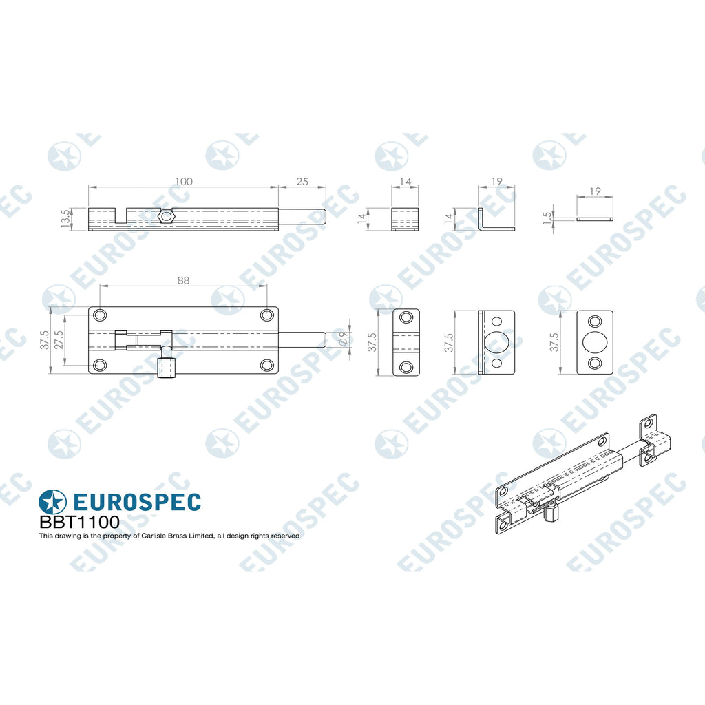 Standard straight barrel bolt. 100mm x 38mm. The simple and popular basic door security device. The bolt is slid into the staple and the finger knob is rotated to engage in the housing slot thus locking it in position. Architectural quality, available in various finishes and sizes. Comes with a 10 year mechanical guarantee and is Fire door rated. Suitable for domestic and commercial use.
