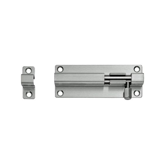 Standard straight barrel bolt. 200mm x 38mm. The simple and popular basic door security device. The bolt is slid into the staple and the finger knob is rotated to engage in the housing slot thus locking it in position. Architectural quality, available in various finishes and sizes. Comes with a 10 year mechanical guarantee and is Fire door rated. Suitable for domestic and commercial use.