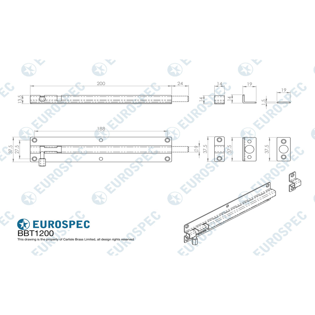 Standard straight barrel bolt. 200mm x 38mm. The simple and popular basic door security device. The bolt is slid into the staple and the finger knob is rotated to engage in the housing slot thus locking it in position. Architectural quality, available in various finishes and sizes. Comes with a 10 year mechanical guarantee and is Fire door rated. Suitable for domestic and commercial use.