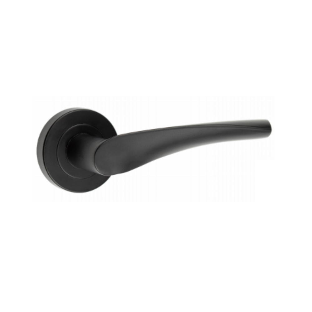 The Nero Vecta Matt Black Lever on Rose Door handle has a screw on rose featuring a uniquely twisting lever that is manufactured from the highest quality grade 304 stainless steel with a grade 4 EN rating with a 30/60 minute fire door rating!