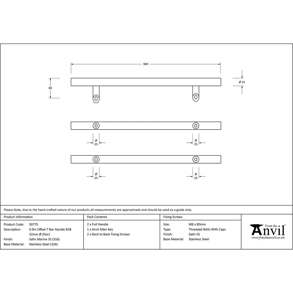 From The Anvil - 0.9m Offset T Bar Handle B2B 32mm Diameter - Satin Marine SS (316) - 50775