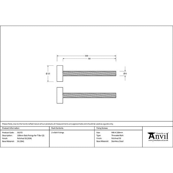 From The Anvil - 100mm Bolt Fixings for T Bar (2) - Polished Stainless Steel - 50272