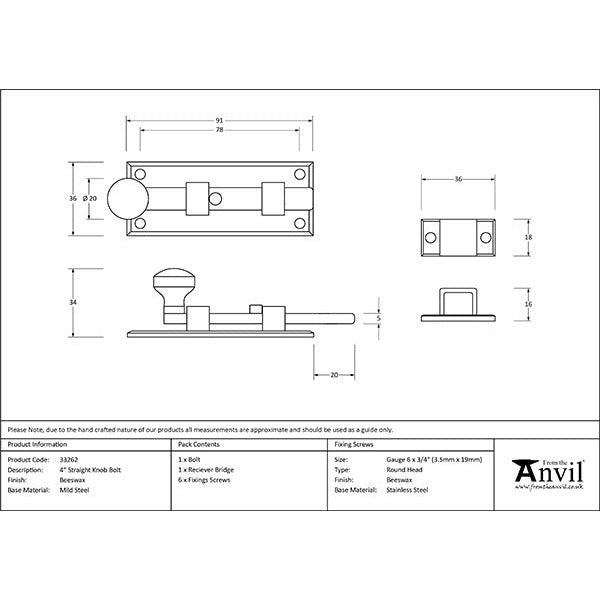 From The Anvil - 4" Straight Knob Bolt - Beeswax - 33262