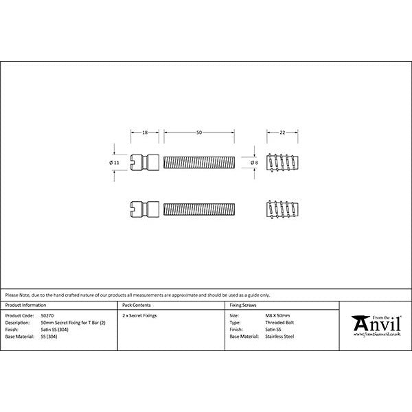 From The Anvil - 50mm Secret Fixings for T Bar (2) - Satin Stainless Steel - 50270