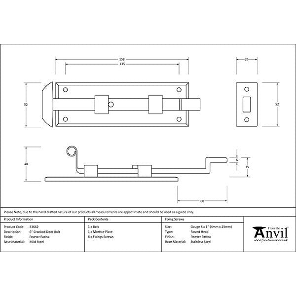 From The Anvil - 6" Cranked Door Bolt - Pewter Patina - 33662