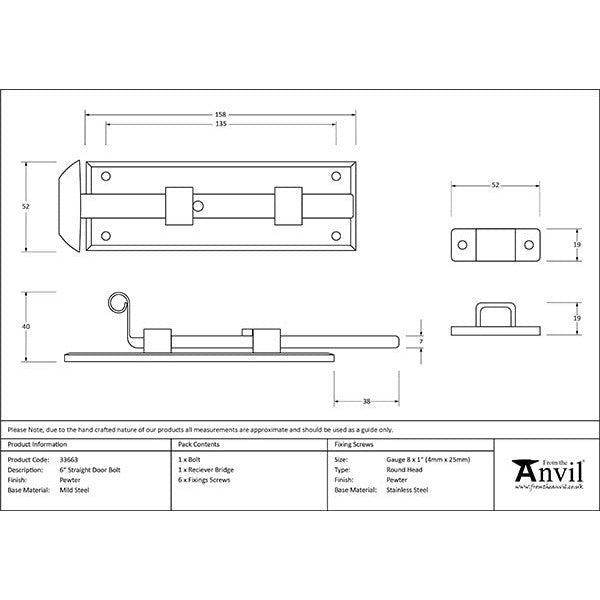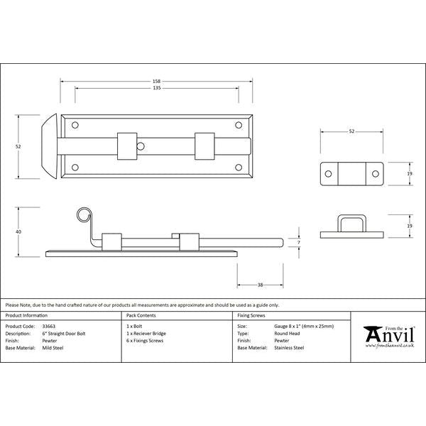 From The Anvil - 6" Straight Door Bolt - Pewter Patina - 33663