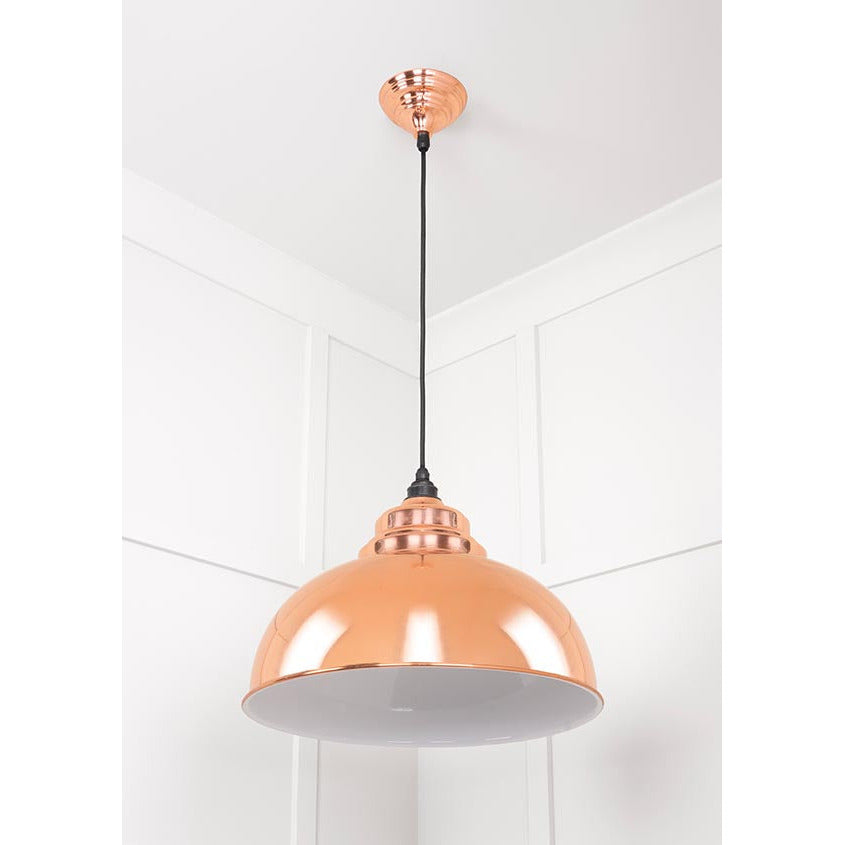 Our Accent pendants are spun from solid copper. When lit, the white gloss interior bounces light and creates a radiant glow, the brightest of our finishes. These pendants work well with a warmer bulb.