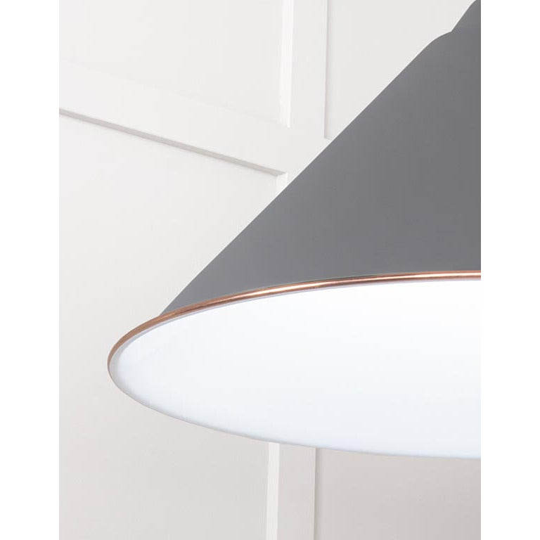 Our Accent pendants are spun from solid copper. When lit, the white gloss interior bounces light and creates a radiant glow, the brightest of our finishes. These pendants work well with a warmer bulb.