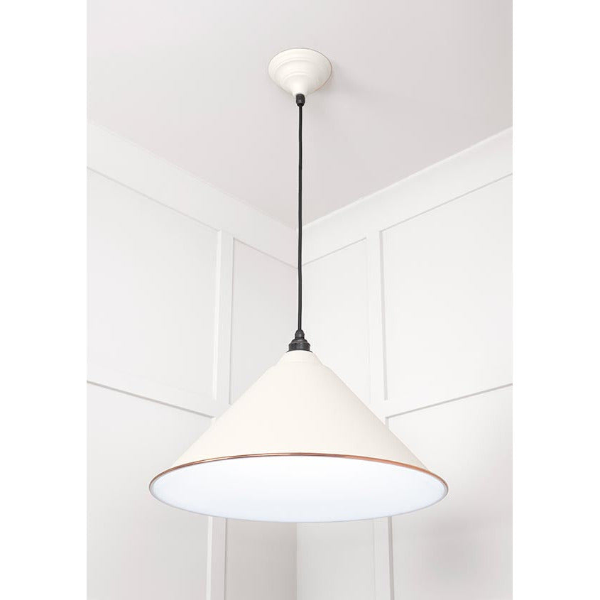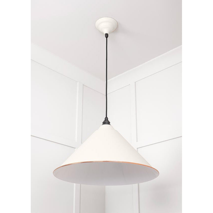 Our Accent pendants are spun from solid copper. When lit, the white gloss interior bounces light and creates a radiant glow, the brightest of our finishes. These pendants work well with a warmer bulb.