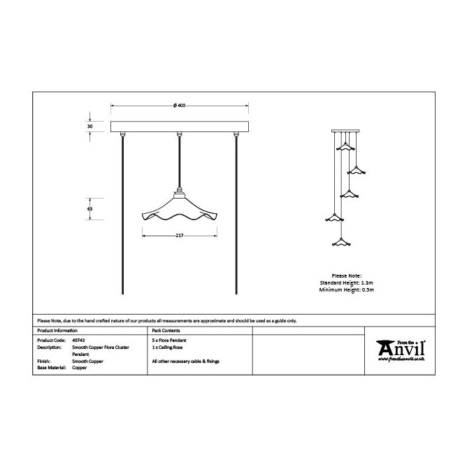 Overall height (from top of ceiling rose to bottom of lowest pendant) 1.3m as standard, pendant heights can be bespokely altered to your preference if needed.