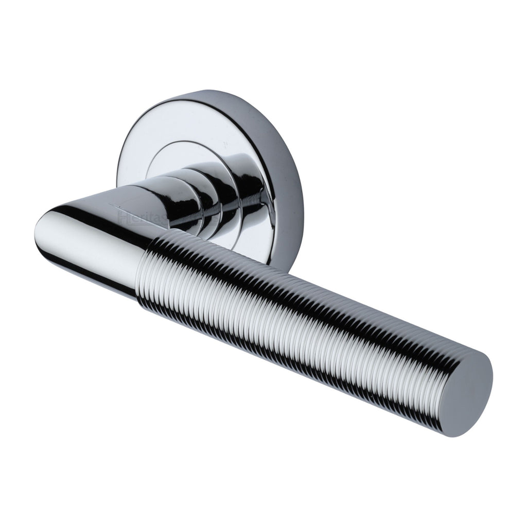 Heritage Brass Door Handle Lever Latch on Round Rose Bauhaus Mitre Reeded Design Polished Chrome finish