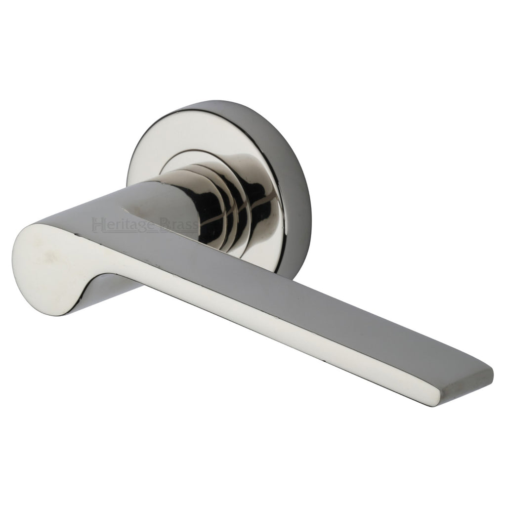 Heritage Brass Door Handle Lever Latch on Round Rose Julia Design Polished Nickel finish
