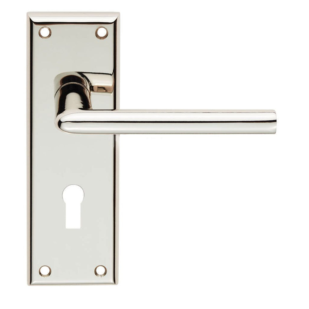 A lever on a chamfered edge rectangular lock backplate. Standard profile 57mm c/c. A slender straight lever with smooth rounded edges forming an decreasing elliptical profile, a minimalist design. Part of the Serozzetta Residential range. Comes with a 10 year mechanical guarantee.