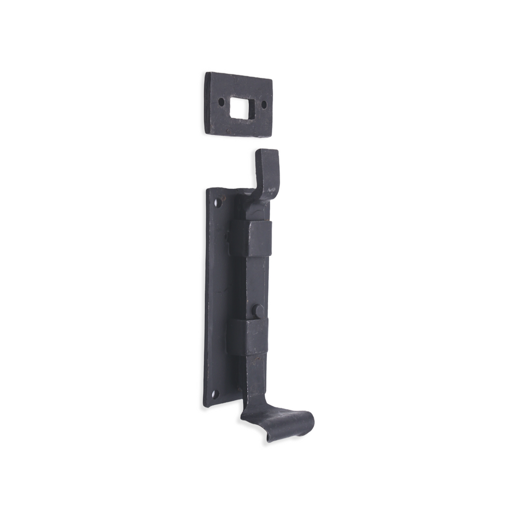 The ‘Cranked Flush Bolt’ decorative hand forged fishtail end is traditionally made and forge-blackened with a beeswax finish. A multi-purpose bolt which can be used horizontally & vertically due to the strong spring mechanism incorporated into the bolts on windows or outward opening doors.